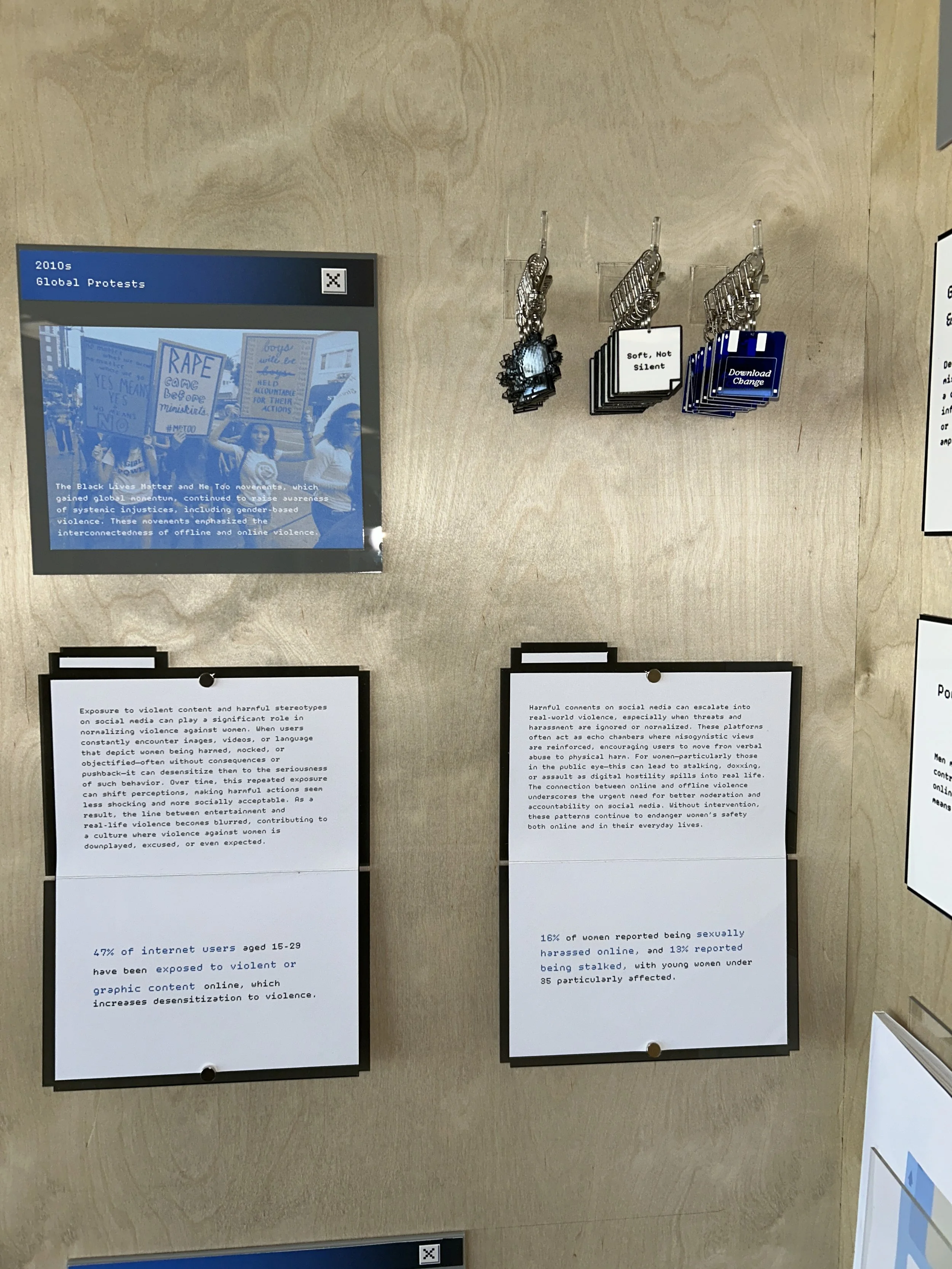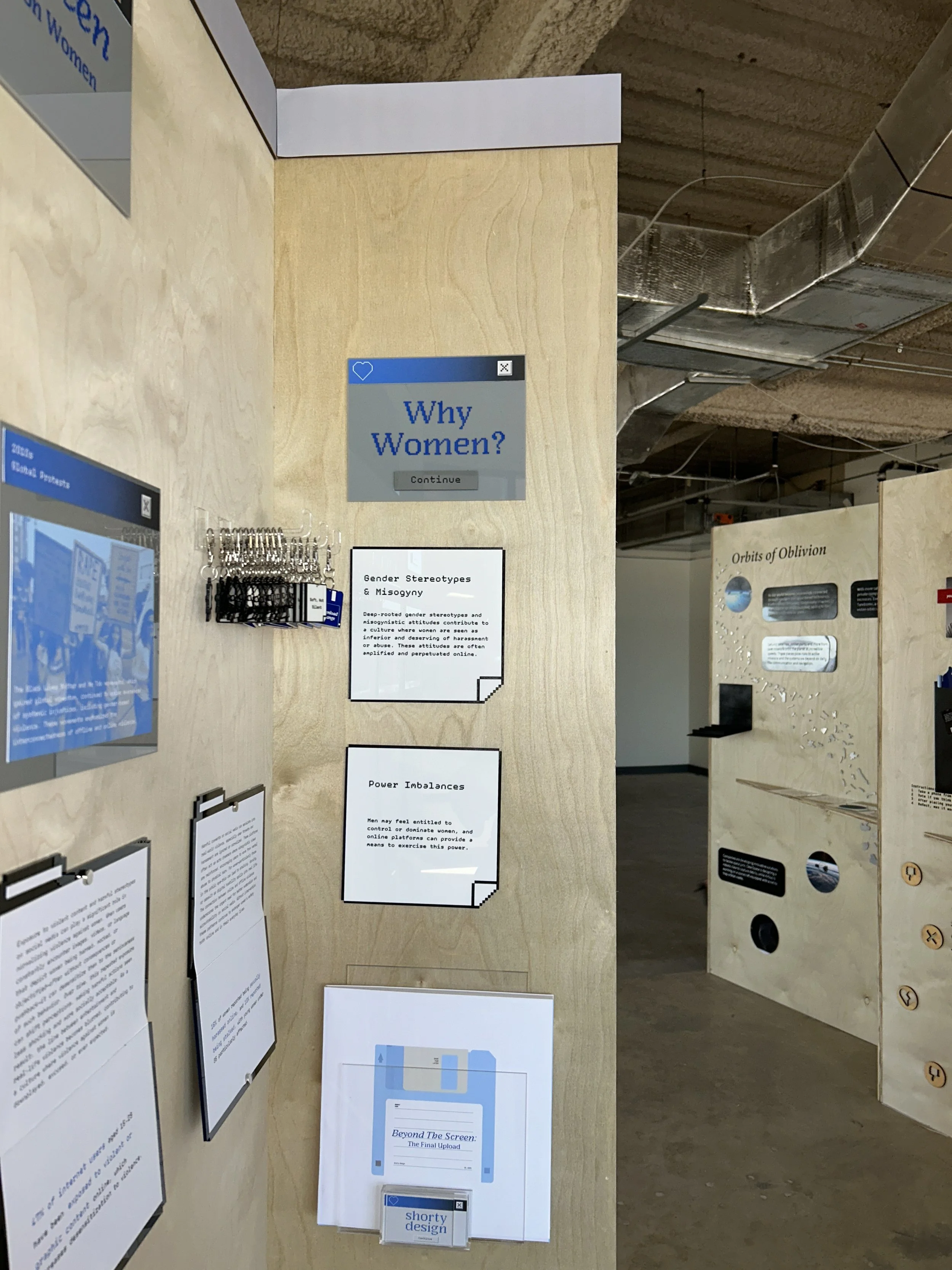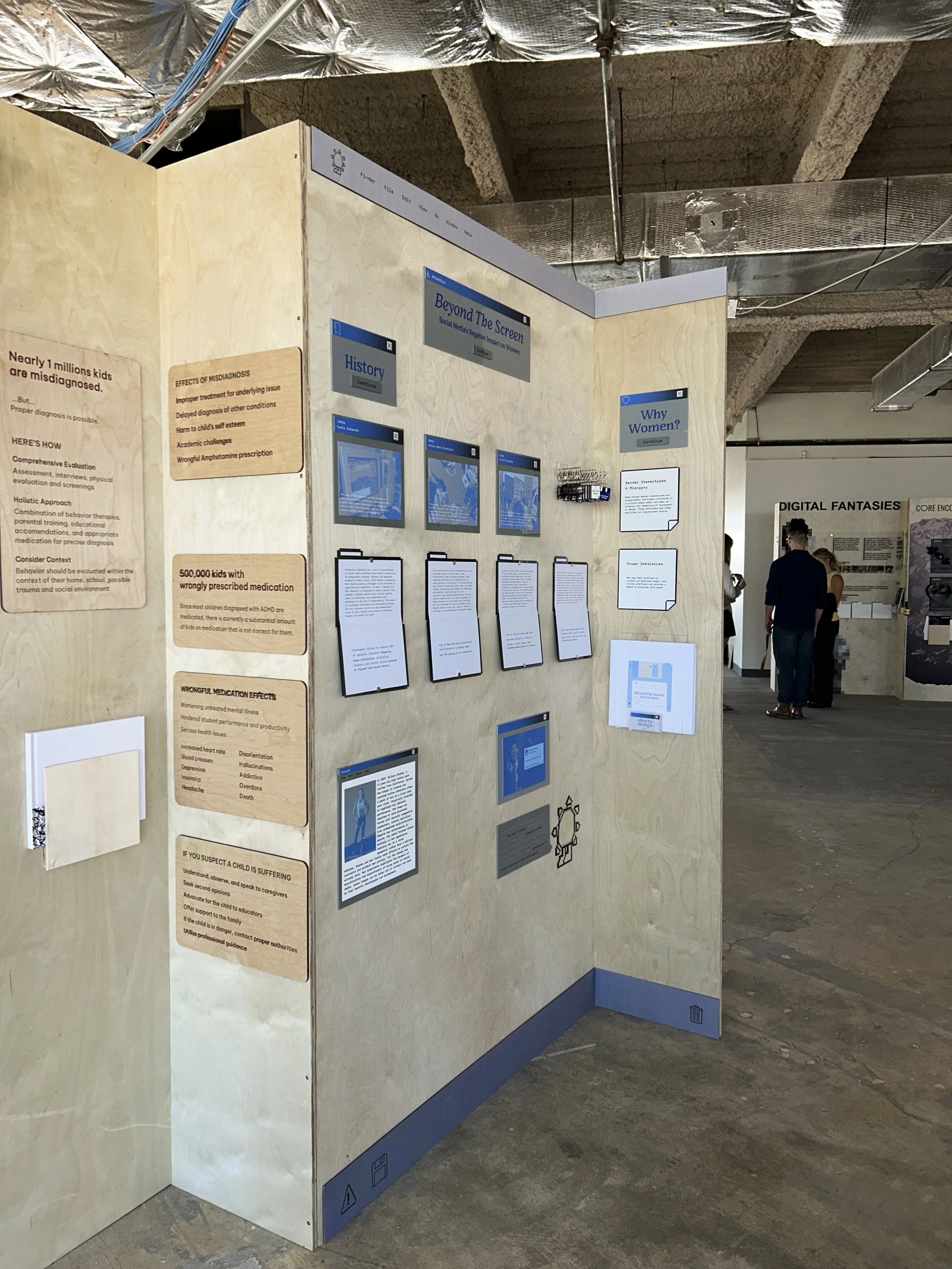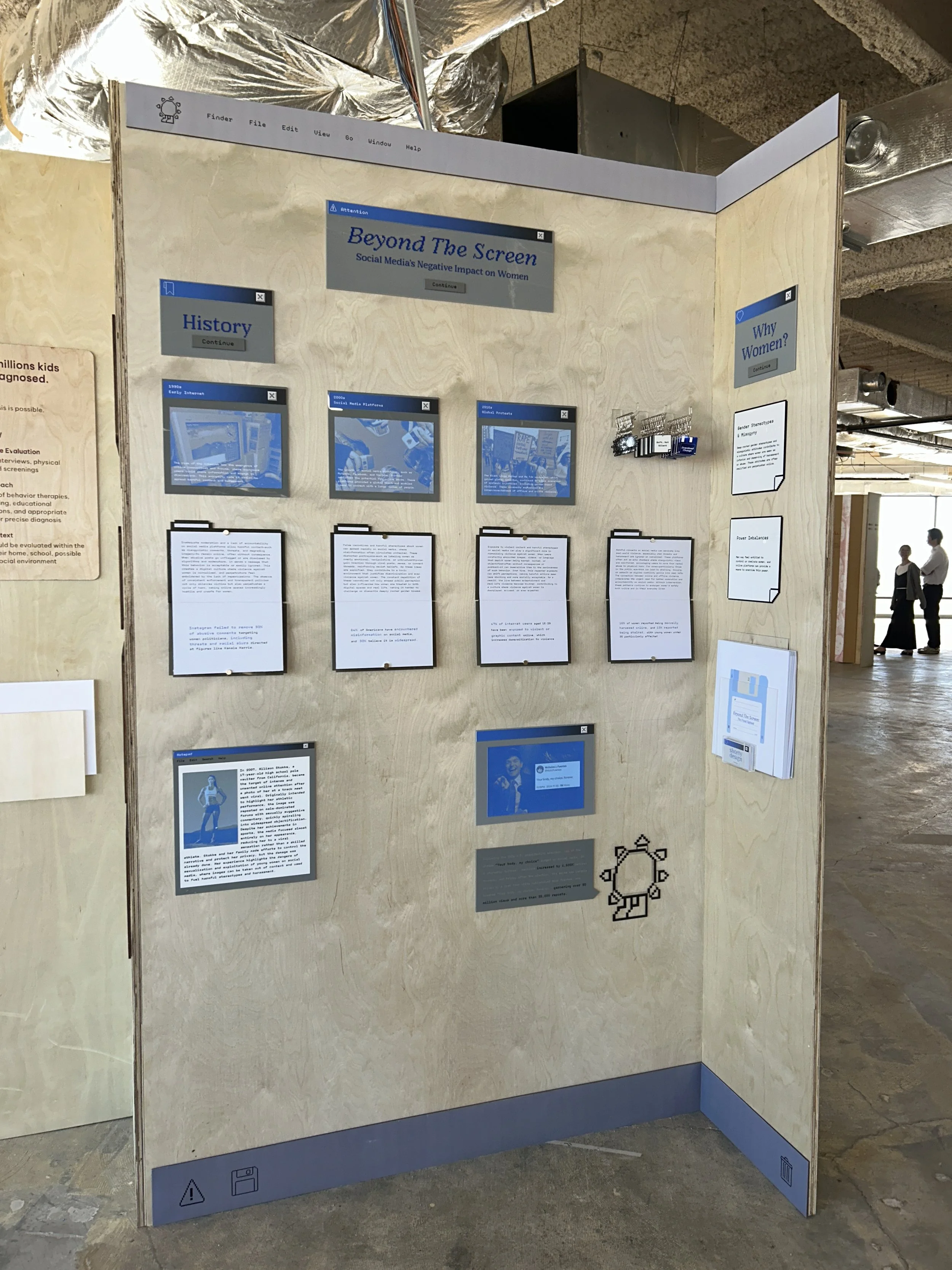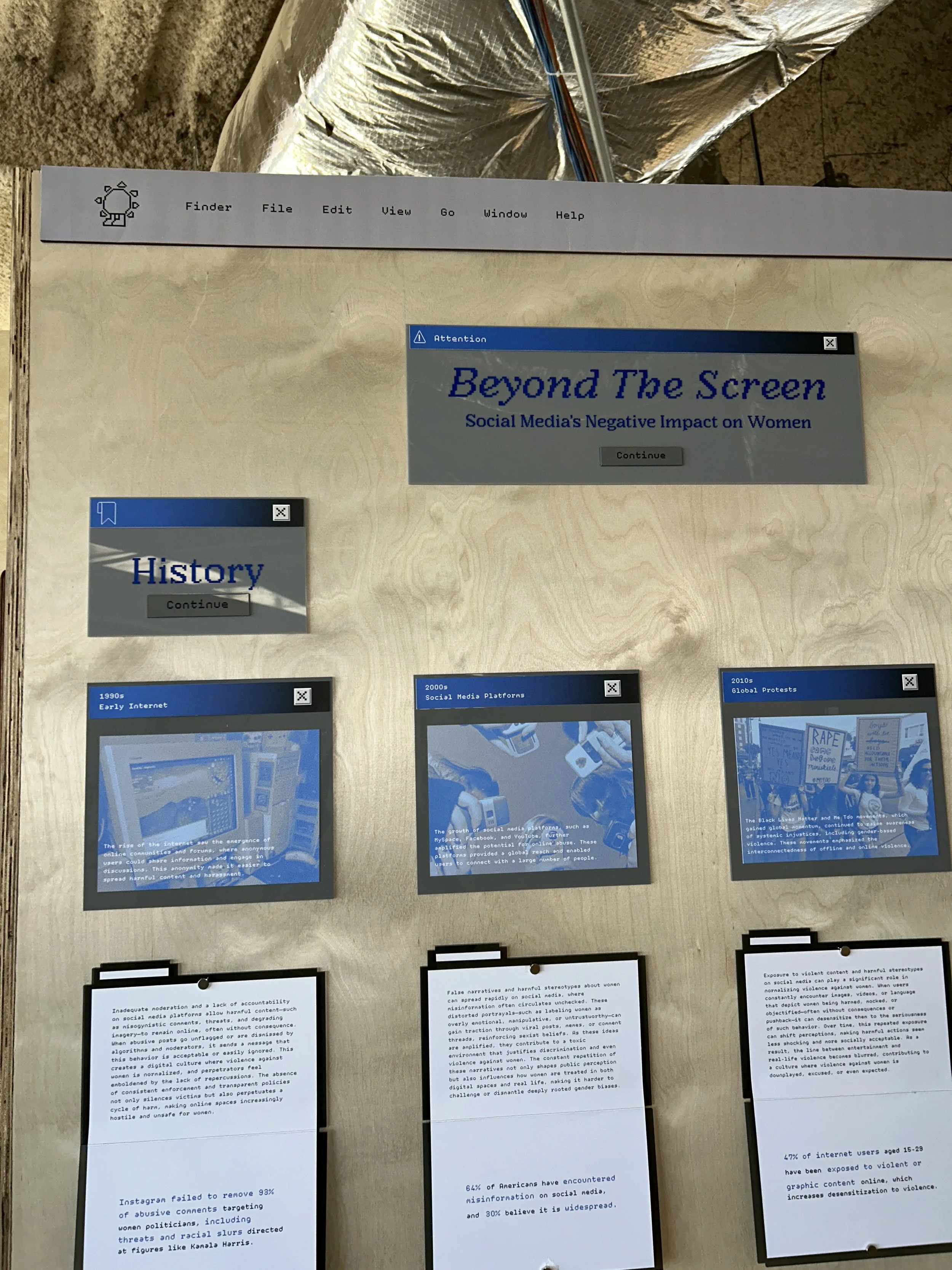 The second part of my thesis involved designing and physically creating an exhibit, as well as a book to go along with the exhibit. We had creative freedom over the content, design style, and materials used on the boards. However, the boards themselves were fixed: 7x4 feet with a 7x1.3 side panel, made of wood. We couldn’t change their size, paint them, or drill into them. For my exhibit, I aimed to transport viewers back to the early days of the internet in the ’90s, exploring how it began and how it has evolved.